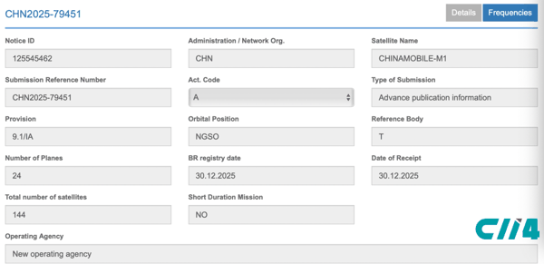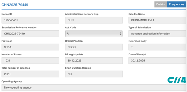 其中, 中国移动申报了两个星座: 分别被命名为CHINAMOBILE-L1,规模为2520颗(编者注:低轨);CHINAMOBILE-M1,规模为144颗(编者注:中轨)。两个星座总计为2664颗卫星。
