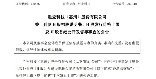2025年8月20日, 胜宏科技 向港交所递交上市申请。2026年3月6日,公司收到证监会就公司本次发行上市出具的《关于胜宏科技(惠州)股份有限公司境外发行上市备案通知书》。
