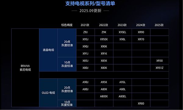 服务过程中,索尼工程师将使用Calman旗舰版软件、专业信号发生器与高精度探头,对电视的亮度、对比度、伽马、色温、色彩等参数进行精细化调校。该服务覆盖索尼液晶与OLED两大品类多款主流机型,可实现20点或10点灰度校准,满足不同用户的专业级色彩需求。