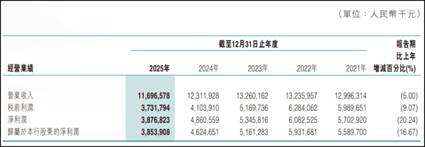 东莞农商银行 2025年业绩报告显示,该行全年实现营业总收入116.97亿元,同比下降5%,连续两年负增长;归属于本行股东的净利润38.54亿元,同比下滑16.67%,这是连续第三年下滑。