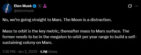 SpaceX已将重心转移至在月球上建造一座可自我扩张的城市,因为我们有望在10年内实现这一目标,而前往火星则需要20年以上。