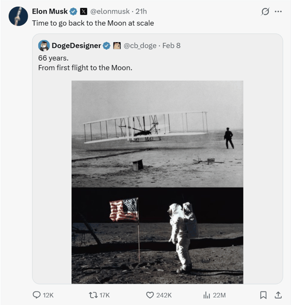 “Time to go back to the Moon at scale.”(是时候大规模重返月球了!)