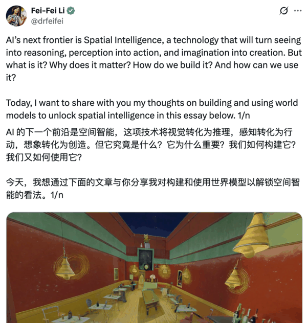 哲学家维特根斯坦曾说,「我的语言的界限意味着我的世界的界限」。我不是哲学家,但我深知,对人工智能而言,世界远不止语言本身。 空间智能代表着超越语言的前沿 —— 它连接了想象、感知与行动,开启了机器真正赋能人类生活的可能,从医疗到创造力,从科学发现到日常助理 。