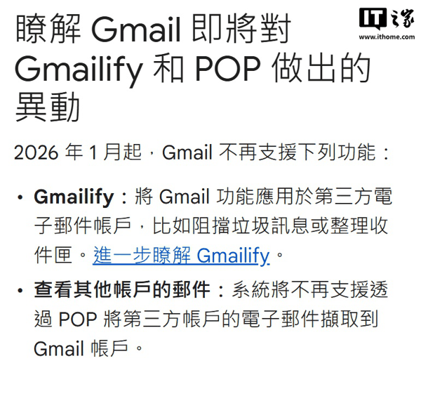 同时谷歌还将在同一时间点停用 Gmailify 功能, 该功能本来可以为第三方邮箱账户启用垃圾邮件过滤、收件箱整理等高级特性 。