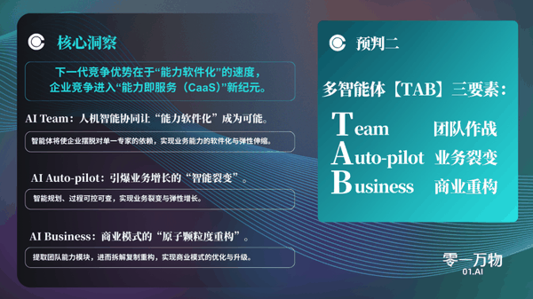 零一万物认为,下一代企业的竞争优势,将取决于其将业务能力转化为数字资产的速度。零一万物提出,多智能体必须具备TAB三要素: