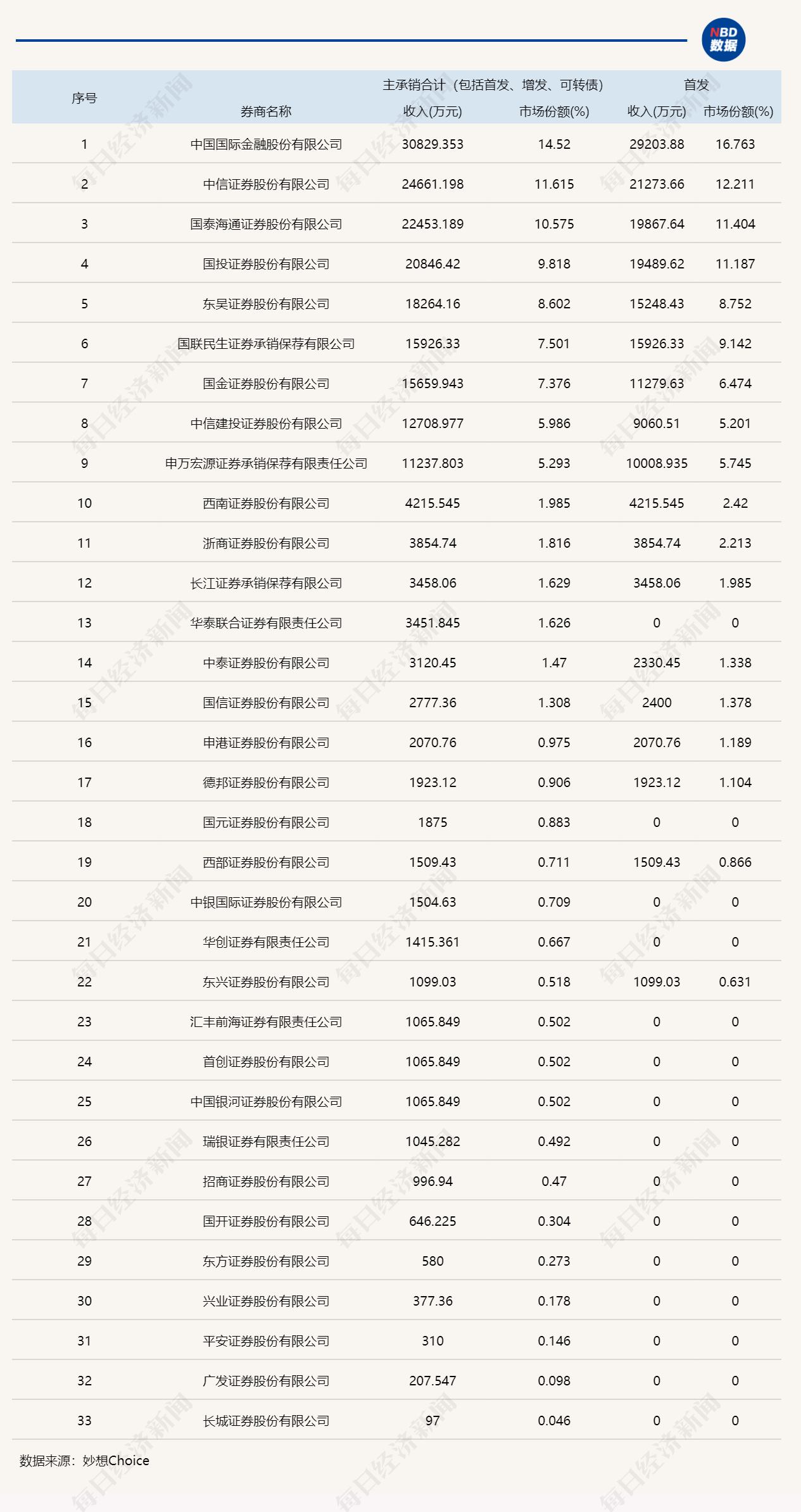 今年一季度券商主承销业务收入排名数据来源:Choice数据