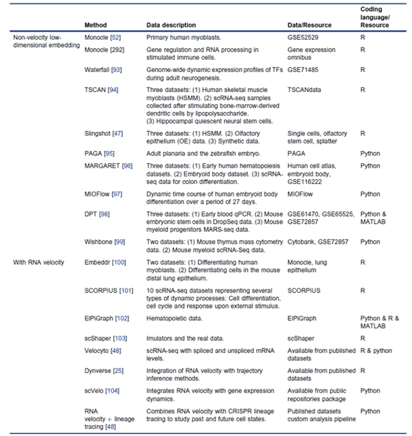 计算方法的核心是 “从海量数据中重构谱系关系”,按是否利用 RNA velocity 分为两类(表2):非 RNA velocity 方法基于单细胞转录组静态快照,通过图基方法(如 Monocle、Slingshot)、流形学习方法(如 DPT、Wishbone)、主曲线方法(如 SCORPIUS、ElPiGraph)等重构轨迹,还包括基于 SNP/CNV 的肿瘤谱系追踪工具(如 EXPANDS、MEDALT);含 RNA velocity 方法则结合未剪接 / 已剪接 mRNA 的动力学特征,预测细胞未来状态,代表工具包括 Velocyto、scVelo、PhyloVelo 等,可同时追溯细胞 “过去谱系” 与 “未来分化路径”,显著提升时间分辨率。