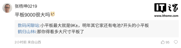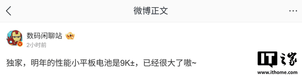 IT之家 12 月 30 日消息,博主 @数码闲聊站 今天在微博透露, 某厂明年发布的性能小平板将搭载 9000mAh± 容量电池 。