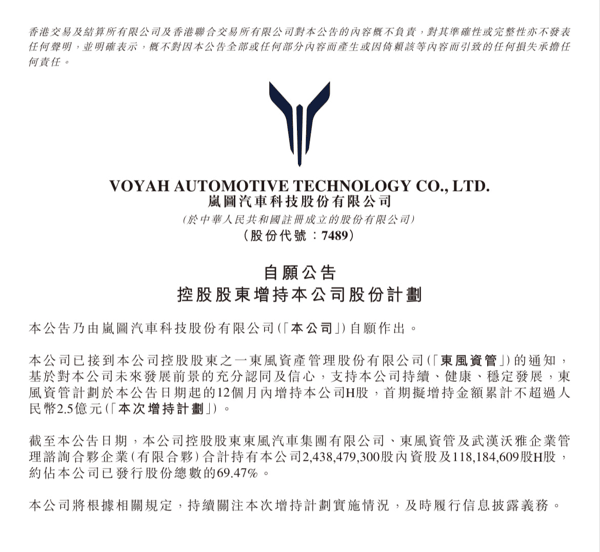 公告明确,东风资管基于对岚图未来发展前景的充分认同及信心,为提振投资者信心、支持公司持续健康稳定发展、维护股价稳定,计划在公告日期起12个月内增持公司H股,首期拟增持金额累计不超人民币2.5亿元。