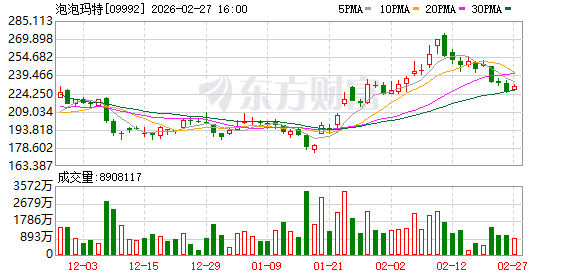 受新品热销推动,泡泡玛特股价在2026年初持续反弹,截至2月27日下午,泡泡玛特股价报229.800港元/股.