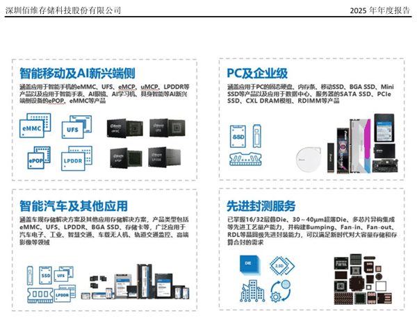 半导体存储解决方案按照应用领域不同,分为智能移动及AI新兴端侧存储、PC及企业级存储、智能 汽车 及其它应用存储等。