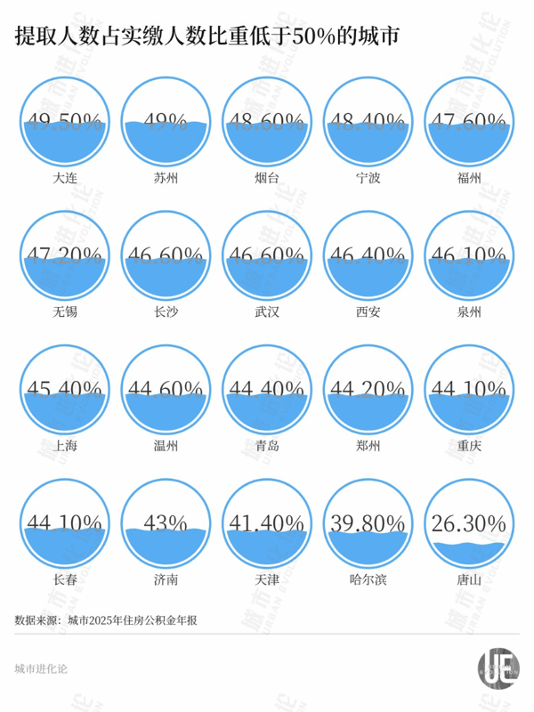 从当年提取公积金情况看,共20座城市提取人数占比不足50%,也就是超过半数的缴存人只缴不用。同时,2025年提取率(提取额占当年缴存额比重)呈负增长的城市多达20余座。