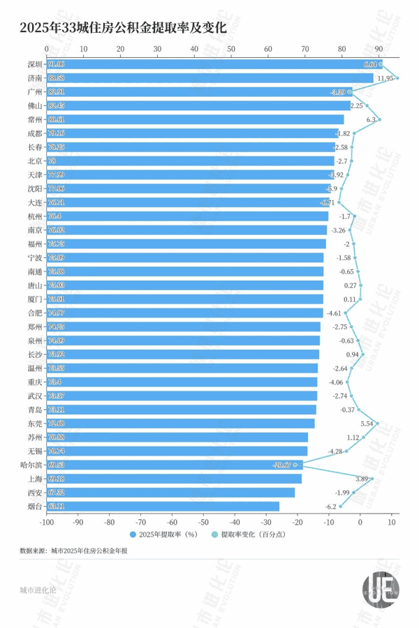 数据显示,33座主要城市中,除济南、深圳、常州等少数城市提取率较上年增长外,其余23座城市均有不同程度下降。提取率下降最多的哈尔滨,从上年90.2%骤降至69.53%,减少超过20个百分点。