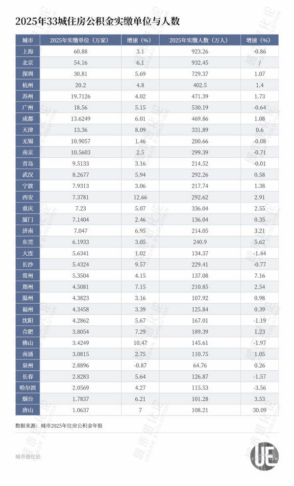 首先来看各城市2025年住房公积金缴存单位和人数规模——上海、北京、深圳稳居前三位,实缴单位分别为60.88万家、54.16万家、30.81万家,实缴人数分别为923.26万人、932.45万人、729.37万人,与其他城市拉开明显差距。这3座城市,同时也是全国城市GDP前三强。