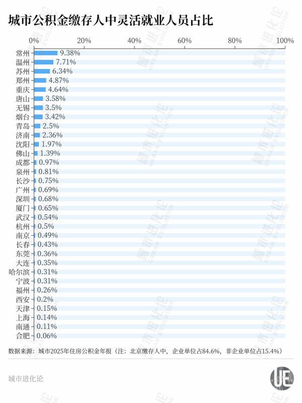 在灵活就业扩面助推下,当地公积金缴存覆盖面提升显著——2025年常州公积金缴存人中灵活就业人员占比近10%,在主要城市中排名第一;缴存覆盖面达25.5%、位列主要城市前列,较获批试点前明显增长。