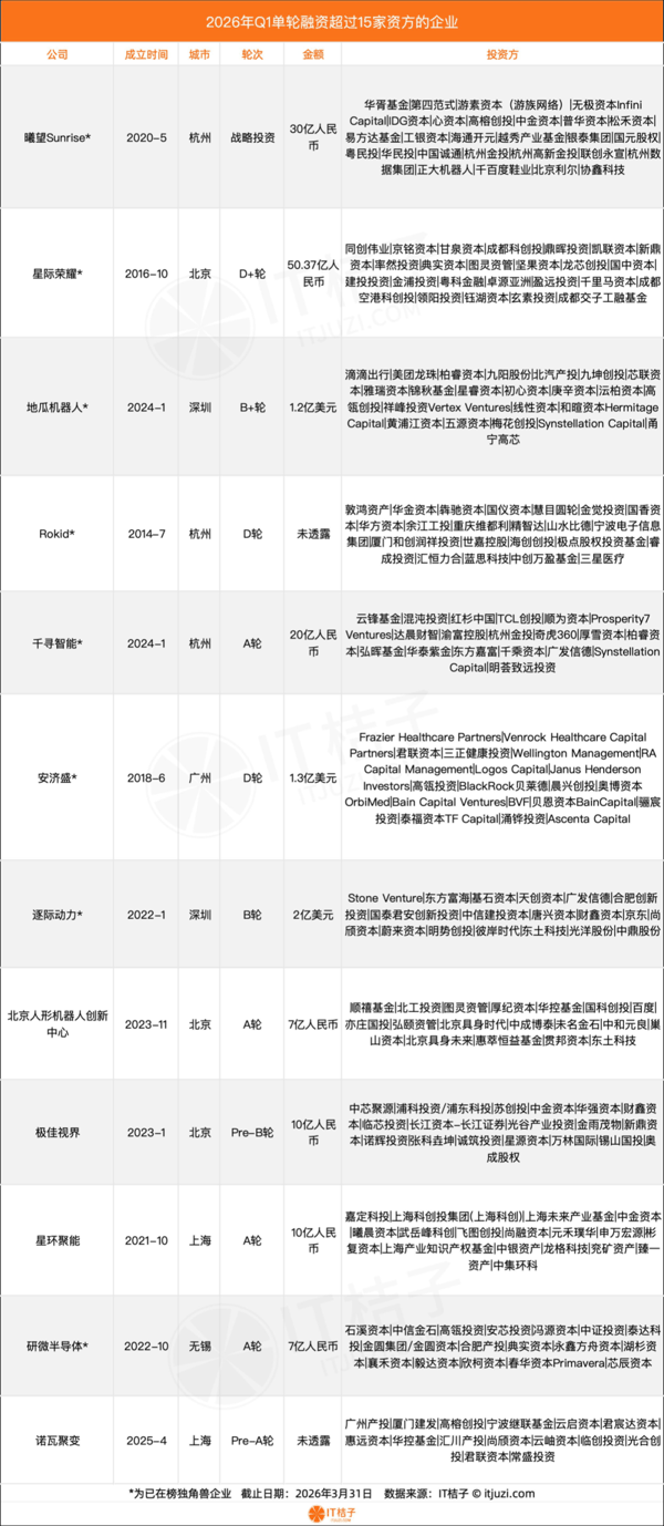 从投资方数量维度观察,一季度“最受欢迎公司”的门槛被抬高至 15 家以上投资方。杭州曦望 Sunrise 以 27 家投资方的阵容领跑,这家成立于 2020 年的 AI 基础层公司在战略投资轮即斩获 30 亿元人民币融资,成为当季单轮投资方最多的公司。紧随其后的是商业航天领域的星际荣耀( 24 家投资方,50.37 亿人民币 D+轮 )和机器人赛道的地瓜机器人( 22 家投资方,1.2 亿美元 B+轮 )。