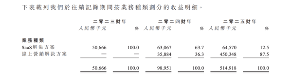 按业务种类划分,其SaaS解决方案收入占比从2024年的63.7%降至2025年的12.5%;线上营销解决方案收入占比从2024年的36.3%逐步提升至87.5%。