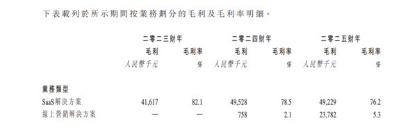 从毛利率而言,两大业务悬殊。SaaS解决方案业务毛利率从2023年的82.1%逐步降至2025年的76.2%,而线上营销解决方案业务的毛利率仅5.3%。