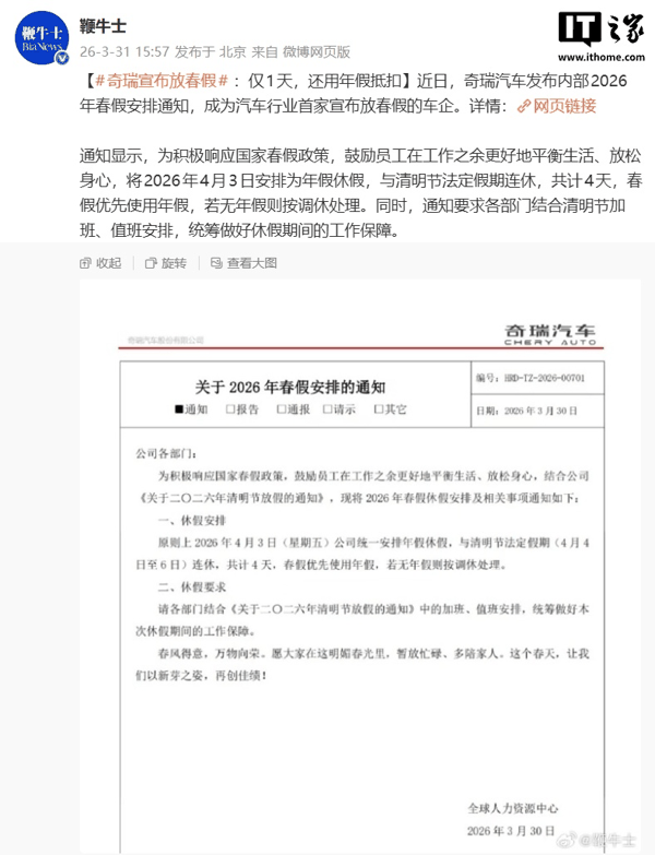 IT之家 3 月 31 日消息,据鞭牛士今日报道,奇瑞汽车发布内部 2026 年春假安排通知,成为汽车行业首家宣布放春假的车企。