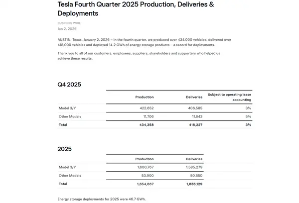 1月4日消息,特斯拉近日公布了2025年Q4的交付数据,Q4交付量418227辆,同比减少16%,预估440907辆。2025年全年,特斯拉交付1636129辆,同比减少8.6%。