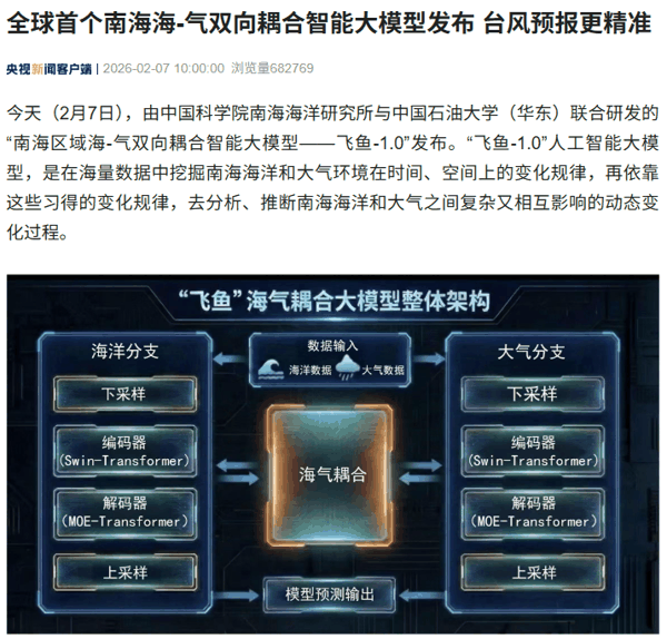 IT之家 2 月 7 日消息,据央视新闻报道,今天,由中国科学院南海海洋研究所与中国石油大学(华东)联合研发的“南海区域海-气双向耦合智能大模型 —— 飞鱼-1.0”发布。