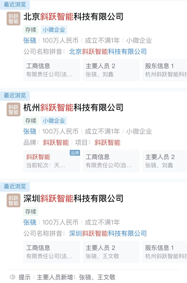 天眼查显示,斜跃智能在上述三地分别注册成立了北京斜跃智能科技有限公司、杭州斜跃智能科技有限公司、深圳斜跃智能科技有限公司,三家公司法定代表人均为张骁,注册资本均为100万元。