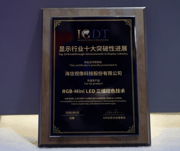 近日,2026年国际显示技术大会(ICDT)在重庆举办。海信凭借显示领域的突破性创新,一举斩获三项重磅大奖,包括全球首创的RGB-Mini LED技术入选“中国显示行业十大突破性进展”奖,成为近十年唯一获得重大突破奖的大屏液晶显示技术,全球首款玲珑4芯真彩背光RGB-Mini LED电视116UX荣膺“年度最佳显示应用产品金奖”,全球首款85吋RGB-Mini LED场序显示高亮数字标牌斩获“年度最佳创新显示应用技术奖”。