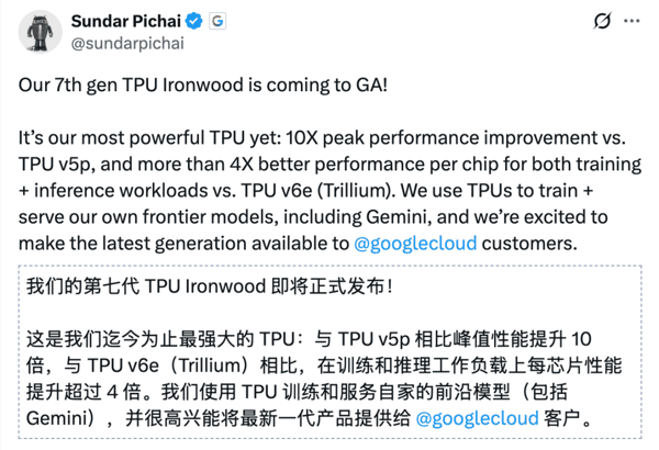 这几天,谷歌终于把憋了很久的大招放出来了,CEO 劈柴官宣了自研第七代 TPU Ironwood 正式商用。