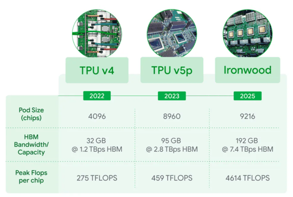 这是谷歌第七代 TPU,单颗算力 4614 TFLOPS(FP8 精度),192GB 的 HBM3E 内存,带宽高达 7.37 TB/s。