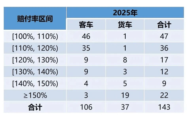 2025年,赔付率超过100%(尚未考虑财险公司日常经营管理费用成本)的高赔付车系有143个,较上年增加6个,其中客车106个、货车37个。