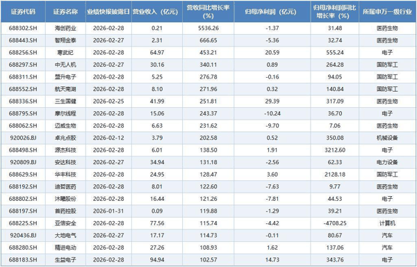 iFinD数据显示,截至2月28日,已有1011家A股公司对外公布2025年度业绩快报,七成公司实现营收同比增长,近六成公司归母净利润实现正向增长。一批高端制造、半导体材料、创新药领域的企业表现尤为突出。