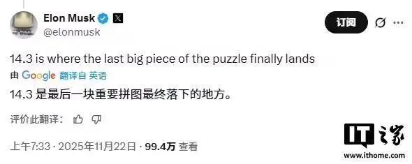 11 月 23 日消息,特斯拉首席执行官埃隆・马斯克(Elon Musk)在公司向用户推送 FSD v14.2 版本数小时后,即公开“剧透”了下一重大更新 v14.3 版本。他称,v14.3 将“是最后一块重要拼图最终落下的地方”。