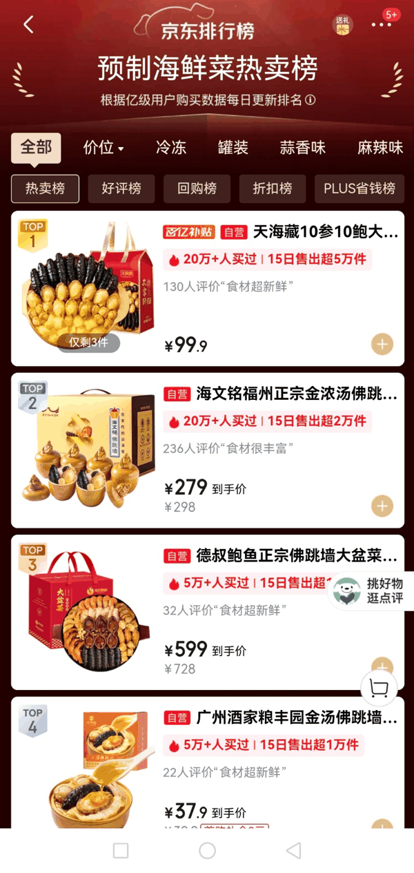 京东 预制海鲜菜热卖榜显示,天海藏“10参10鲍海鲜大盆菜”近15日销量超5万件。