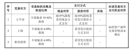 公告显示,本次定增交易由两部分构成,核心聚焦萤石资源整合。交易对方为王中喜、王琛父子及二人控制的上海柏帝投资管理有限公司,其中王中喜持有丰瑞氟业55.92%股权,王琛与柏帝投资各持有6.99%股权。支付方式上,王中喜所持20.97%股权采用现金支付,其余34.95%股权及另外两方所持全部股权以发行股份方式支付,发行价格确定为8.60元/股,不低于定价基准日前120个交易日股票交易均价的80%。