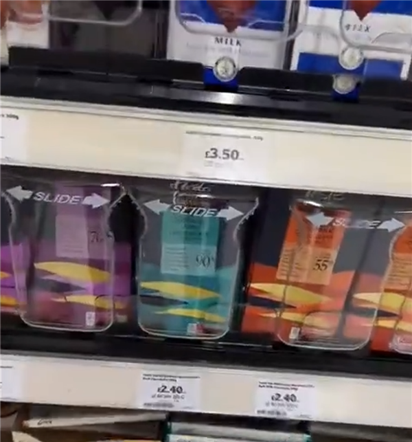 为防止巧克力被盗,不少英国商家在货架上安装了塑料防盗盒,顾客需要联系店员开锁拿取。