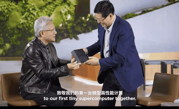 对话最后,杨元庆亲手将一台最新的ThinkStation PGX工作站递给黄仁勋,黄仁勋郑重签名并表示“致敬我们的第一台微型高性能计算”。