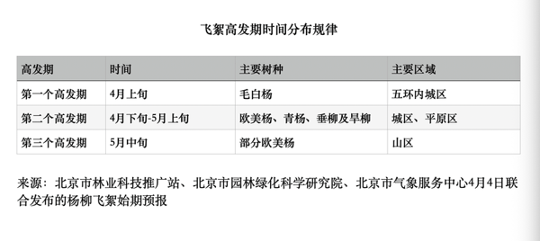 4月4日,北京市林业科技推广站、北京市园林绿化科学研究院、北京市气象服务中心联合发布了今年杨柳飞絮始期预报,中心城区为4月6日-8日,在全市范围内,飞絮期一般从4月上旬到5月下旬,持续50天左右。预报还提到,无证据表明飞絮本身会导致过敏,敏感人群若出现过敏症状应及时到医院就诊,排查过敏原。