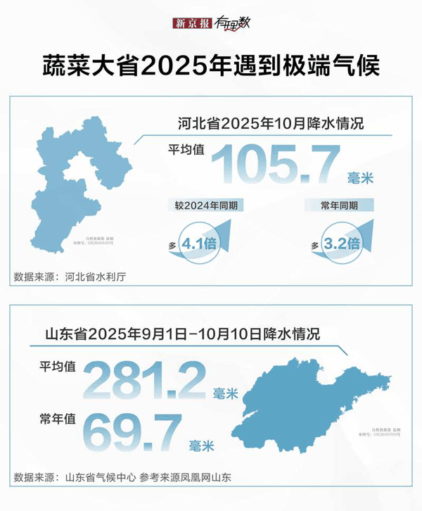 2025年秋季北方蔬菜主产区遭遇持续降雨、气温骤降等不利天气影响。2025年9月至10月,华北南部、黄淮等地出现10轮降水过程,较常年同期偏多1至4倍;加之冷空气侵袭,中东部大部地区气温迅速下降。