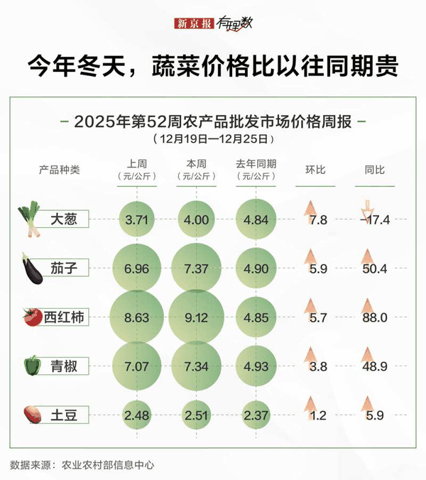据农业农村部数据,2025年12月19日至25日,全国286家产销地批发市场监测到的19种蔬菜价格平均价格为5.36元一公斤,同比上升28.2%。