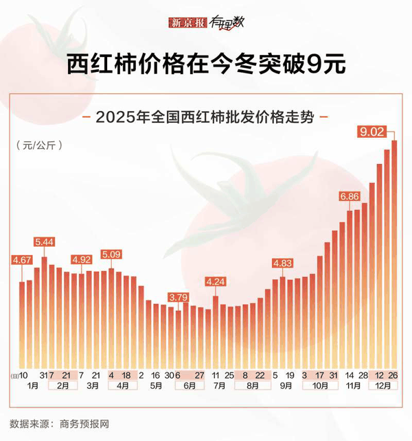 从商务预报网的数据来看,近一年来,全国西红柿市场价格持续走高。2025年1月,每公斤售价仅为4.67元,到了今年一月初价格飙升至9元以上,差不多翻了一倍。