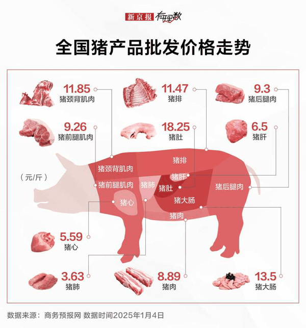 农业农村部统计显示,今年猪肉价格相比去年同期明显下降。在四川江油的农贸市场,五花肉价格9元一斤,前后腿肉8元一斤,相比去年同期每斤低了3-4元。北京新发地市场12月下旬猪肉零售价也维持在低位,五花肉、里脊等品种同比下跌约20%。