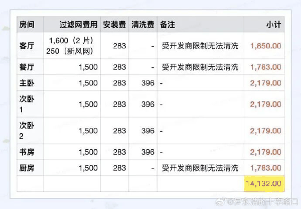 在罗永浩吐槽大金空调的这条微博中,他罗列了更换滤网和清洗空调的费用明细。其中,由于大金的滤网设计使用寿命仅有一年,更换滤网是本次服务的大头,占总费用的70%。