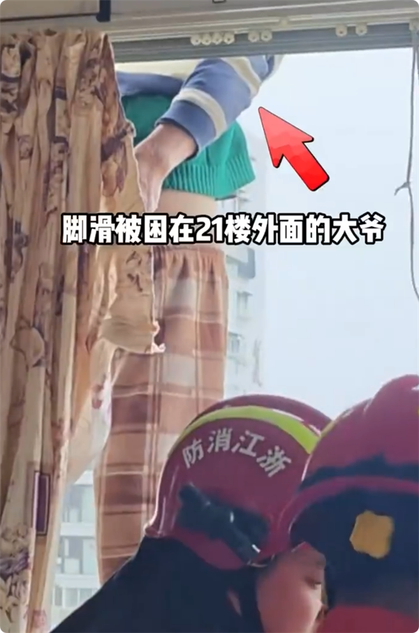 不料中途脚下打滑失控,惊险悬停在21楼窗外,所幸被邻居及时发现并报警,消防人员迅速到场展开救援,最终成功将大爷安全救回室内。