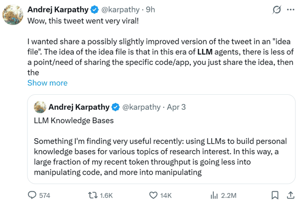 就连 Karpathy 自己都忍不住自夸一句:哇,我这条推文真的火爆了!
