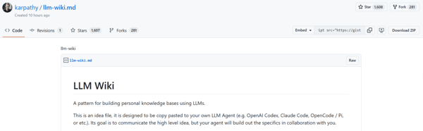Karpathy 把这个想法整理成 gist 形式进行分发:你可以把它交给你的 agent,它会帮你构建一个属于你自己的 LLM wiki,并指导你如何使用等等。