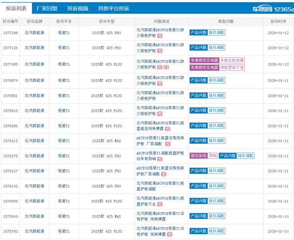 快科技1月12日消息,汽车第三方投诉平台 【下载黑猫投诉客户端】 车质网显示,北汽极狐T1遭车主集体投诉,投诉原因普遍为“底盘减配护板,高压线束裸露在外”,涉及车型均为2025款极狐T1。