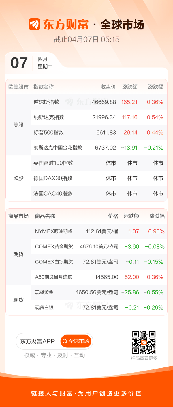 商品市场: 国际油价04月06日上涨。截至当天收盘,纽约商品交易所WTI原油期货当月连续合约上涨1.07美元,收于每桶112.61美元,涨幅为0.96%。COMEX黄金期货当月连续合约下跌3.60美元,跌幅0.08%,报4676.1美元/盎司。COMEX白银期货当月连续合约下跌0.11美元,跌幅0.15%,报72.815美元/盎司。现货黄金下跌25.86美元,跌幅0.55%,报4650.56美元/盎司。现货白银下跌0.21美元,跌幅0.29%,报72.81美元/盎司。