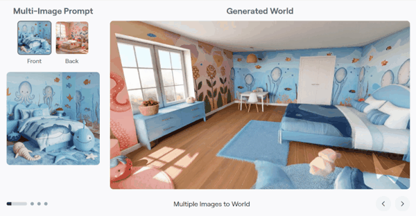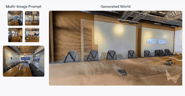 例如,多图提示(multi-image prompts), 可为世界不同区域提供不同参考图,将多视角内容拼接为统一的 3D 空间。