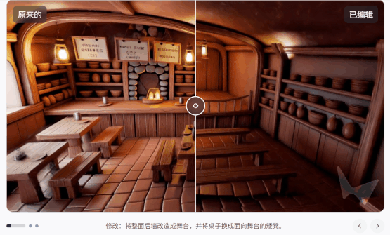 支持局部与大范围修改,包括对 象移除/替换、局部修饰、视觉风格调整、结构性重构等,满足迭代式创作流程。