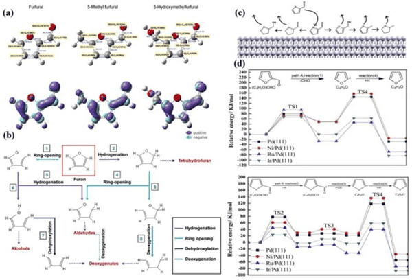 图 3 (a) Gua、V an和BA典型单体化合物的量子结构分析;(b)呋喃在不同表面上对脱氧产物、氧化产物和环氢化产物的活化示意图;(c)糠醛HDO的反应途径;(d)不同金属上糠醛脱碳机理的比较
